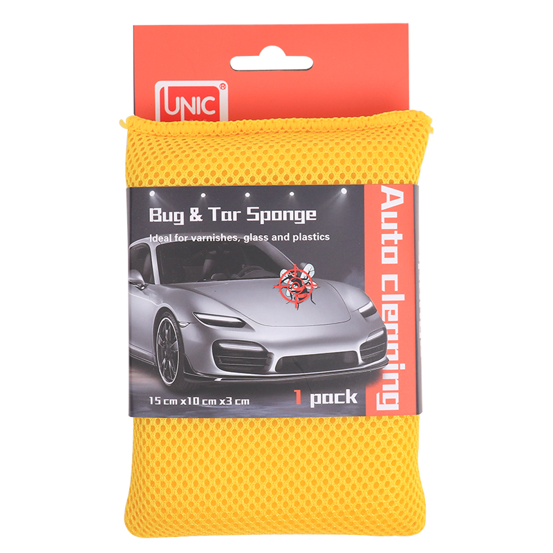 Bug & Tar Sponge effortlessly removes insects, tar and dirt from paintwork,glass andpla tics, quickdy and without scratching. After use; rinse the spongewith water and leave todry Washing: Machine washable in 60C, gentle