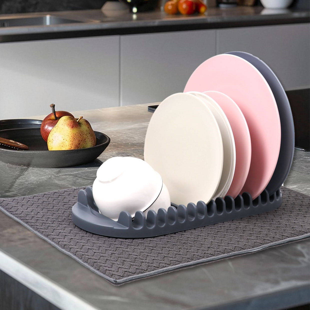 dish drying mat easy to useeasy to cleanall-one dish drying solution. DISH DRYING MAT 2-IN-1:Dish rack holds up to 21 plates-Extra drying space.Easy foldable desingn.2-IN-1AFDRUIPMAT: Acts as a cushion to protect.delicate dishes and stemware.